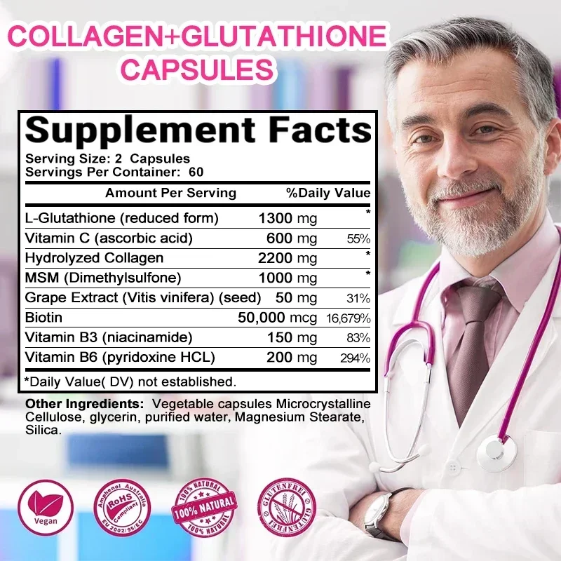 Hydrolyzed Collagen 2200mg Glutathione 1300mg Biotin MSM and Vitamin C B6 B3 Capsule Nutritional Supplement